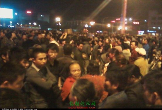 (维权网信息员萧和协报道)3月27日下午六点,广西桂林市临桂县300多名村民自发到县城中心广场(大圆盘),进行和平示威。政府出动上百防暴警察驱逐抗议人群,引来数千市民围观,抗议活动一直持续到当天晚上十一点。