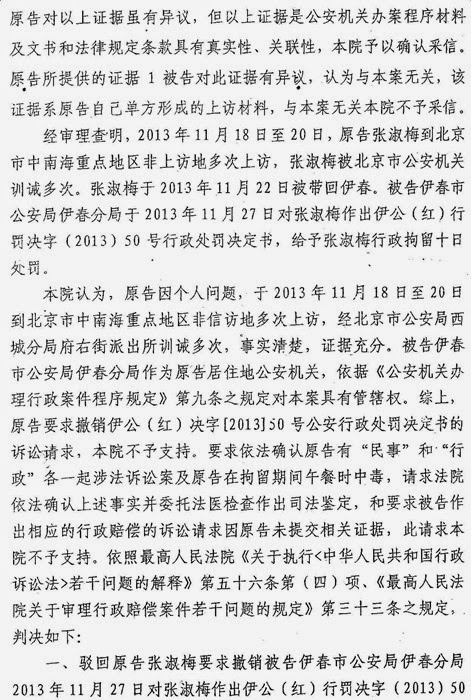 2013年11月20日上午,去府右街邮局寄信访材料的张淑梅被北京警方抓到府右街派出所,警察不听她的解释,训诫后将其关进马家楼,在黑监狱被关2天后于22日被伊春截访人员接出,当天被押送回伊春,回伊春后先把她非法囚禁在一家小旅馆里达4天之久,期间有六人分三班看守她,她住的房间门在外面反锁,屋里24小时亮着灯,每天给四个馒头、两碗汤。在张淑梅的强烈抗议和反抗下,11月27日,当地政府指示所辖警方以她多次到中南海等非上访地上访为由,无端对她行政拘留10天。被关进拘留所的第八天,在中午吃饭的时候张淑梅食物中毒,当时的症状是面部苍白胖肿、头昏迷、腹部剧痛、喉咙干哑、大小便失禁,她报警后,所内警察不予施救,释放后经多方治疗但至今仍全身无力并时断时续的神志不清,张淑梅不甘于无辜被行拘和拘留所内遭投毒残害,一纸诉状将伊春市公安局伊春分局告上法庭,请求依法撤销对她的非法行拘和对她在拘留所内遭投毒残害进行依法赔偿。当地法院受理了她的状告,于2014年4月21日开庭审理,但法院和警方沆瀣一气继续枉法,4月21日开庭,这个驳回了张淑梅所有诉求的判决书竟然在4月8日就已经作出。