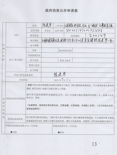申请人于2015年7月 1日向外交部提出13份政府信息公开申请,要求外交部公开中国政府对《禁止酷刑和其他残忍、不人道或有辱人格的待遇或处罚公约》的委员会的结论和建议 (CAT/C/CHN/CO/4)的评论,第14段:2007 年,中国法院审结的国家刑事赔偿案件为 959 件,其中包括因遭受酷刑而获得国家赔偿的案件。959 件国家刑事赔偿案件当中,有多少是因遭受酷刑而获得国家赔偿的案件(申请表1)。因遭受酷刑而获得国家赔偿的案件的具体细节,包括受害者的名字(申请表2)。因遭受酷刑而获得国家赔偿的案件的具体细节,包括遭受酷刑的案发地点(申请表3)。