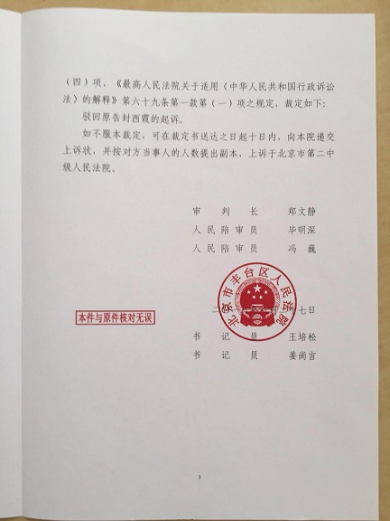 (维权网信息中心报道)2018年8月29日,本网获悉:今天,陕西维权人士封西霞收到北京市丰台区“人民”法院的驳回起诉裁定书,该驳回起诉的行政裁定书,居然将警察强制传唤当事人的手续,认定为非政府信息公开条例第二条规定情形,这种公然颠覆成文法法律体系的枉法裁判行为,坐实了公安作为国家暴力机器中的老大地位。
