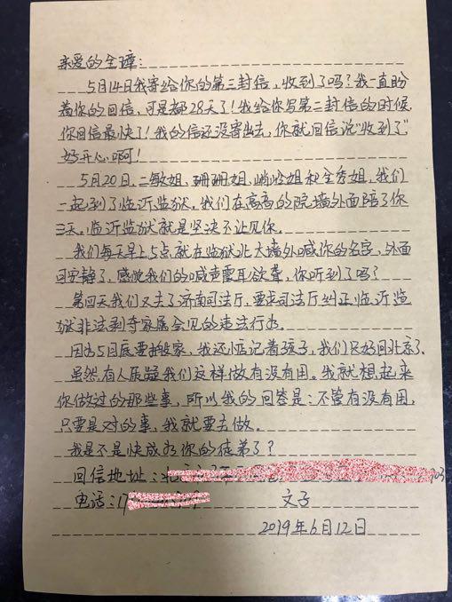 5月20日,二敏姐、珊珊姐、峭岭姐和全秀姐,我们一起到了临沂监狱。我们在高高的院墙外面陪了你三天。临沂监狱就是坚决不让见你。
