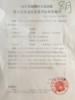 (维权网信息中心报道)2021年10月29日,本网获悉:福州维权人士林兰英刚刚收到鼓楼区法院(2021)闽0102行初399号《传票》:林诉仓山区城乡居民社会养老保险中心违法要求退还养老案,将于11月12日在十七法庭公开开庭审理。