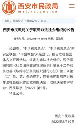 2022年8月19日,其教会被西安市民政局迅速发布通告取缔,理由是其与“中华福音总会”、“中华福音总会”西安区联会,“未经登记”就擅自以社会团体名义开展活动,故被认定为非法社会组织;迄今为止,其案虽已有多名维权律师介入,但其等3人被秘押半年,警方一直以当事人案情涉及危害国家安全为由拒绝律师会见。
