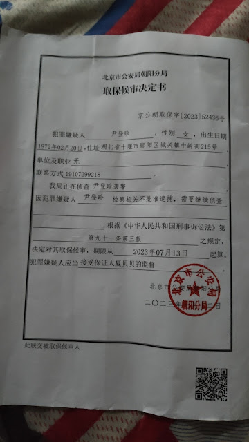 (维权网信息中心报道)2023年7月13日,本网获悉:被北京市公安局朝阳分局无事实根据和法律依据刑事拘留并关押看守所13天的湖北十堰淋巴癌访民尹登珍,在昨天晚上被该分局以“检察机关不批捕、需要继续侦查”为由取保候审,且没有“保人”和“保金”的取保候审。