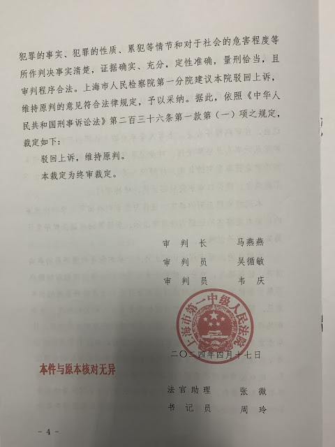 (维权网信息中心报道)2024年4月19日,本网获悉:2024年4月17日,上海第一中院就著名人权捍卫者季孝龙案作出二审判决——维持一审4年6个月的判刑结果。